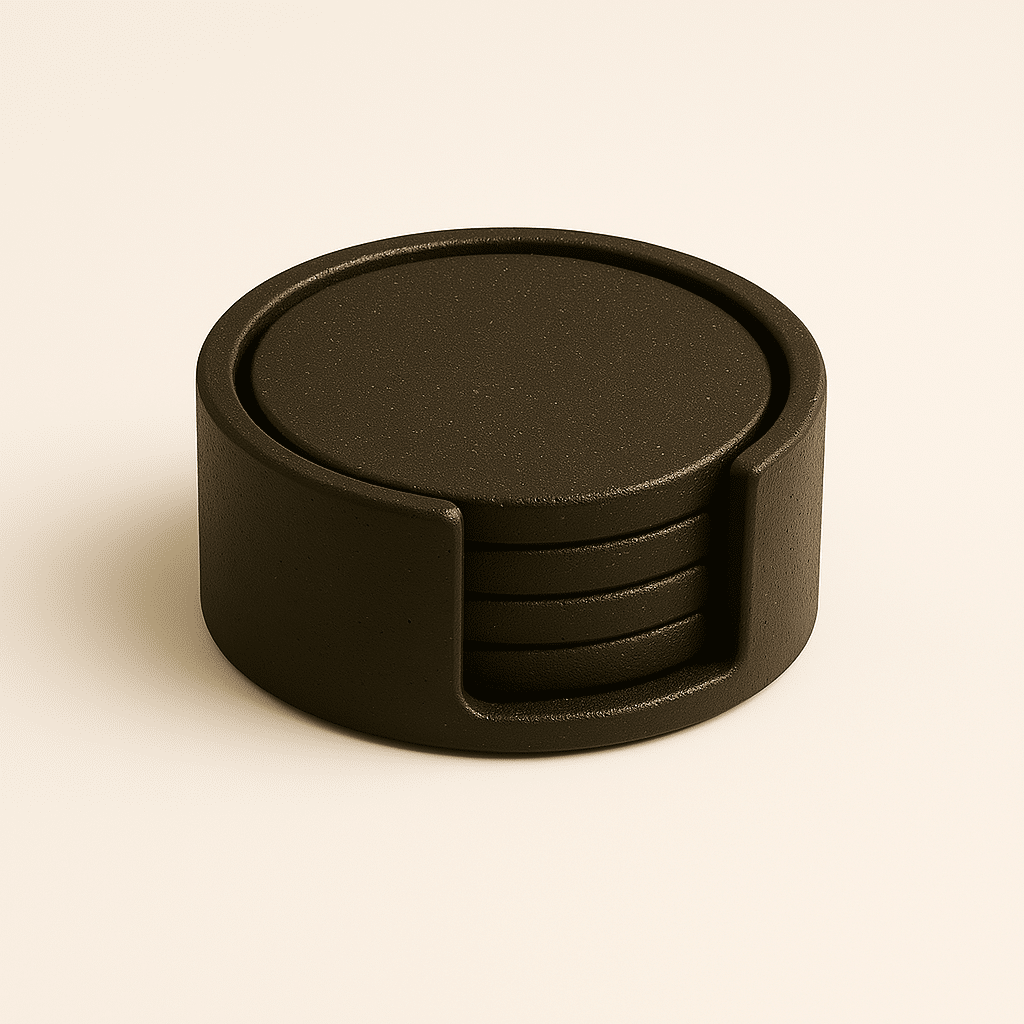 Contenedor cilíndrico que organiza los posavasos como piezas minerales.