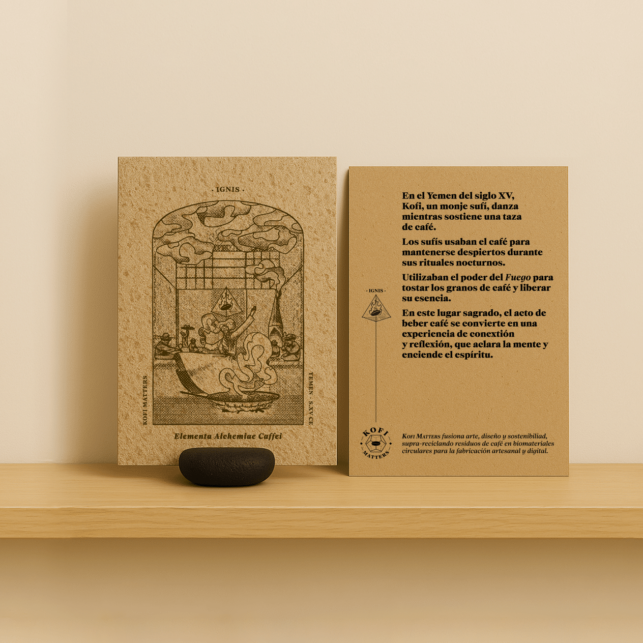 Obra grabada en papel artesanal de café + narrativa en papel kraft