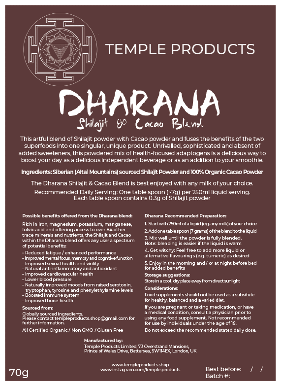 Rich in iron, magnesium, potassium, manganese, fulvic acid and offering access to over 84 other trace minerals and nutrients, the Shilajit and Cacao within the Dharana blend offers any user a spectrum of potential benefits: